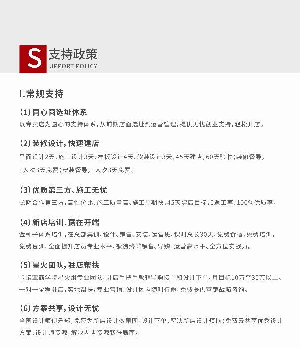 以上就是关于加盟全屋定制扶持方面的介绍了,当然每个品牌的扶持政策都是不一样的,具体还是要以实际情况为准。加盟全屋定制选择卡诺亚定制家居品牌,可免加盟费,送装修,返样板,并提供了全面的扶持政策,加盟开店全程都有专业人员为你服务,专业优秀的成熟团队,帮助专卖店快速成长,让投资者的店面在市场上更具优势,获利有所保障。 想要了解具体的扶持政策可咨询在线客服。