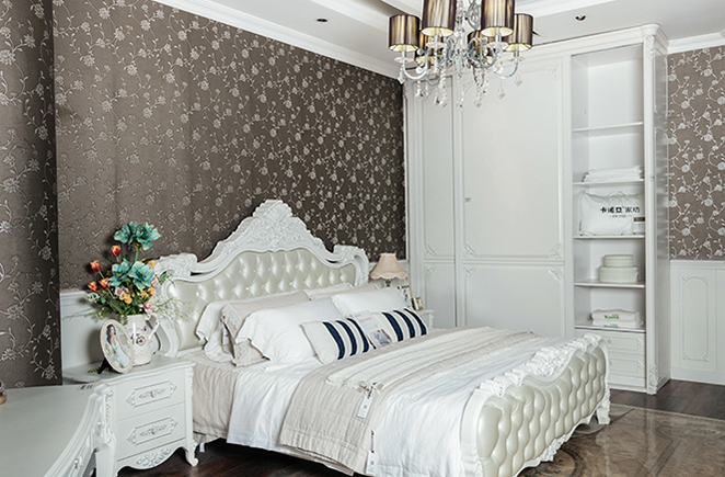 法式的优雅与浪漫的醇白,优美的线条搭配精致的雕花,加上隐约的银光暗现,渲染出一种极具艺术美感的法兰西风情,营造浓郁的欧洲宫廷生活。空间以暖色为主色,床头精致的雕花设计,如艺术品般,给卧房增添精雅的装饰效果。