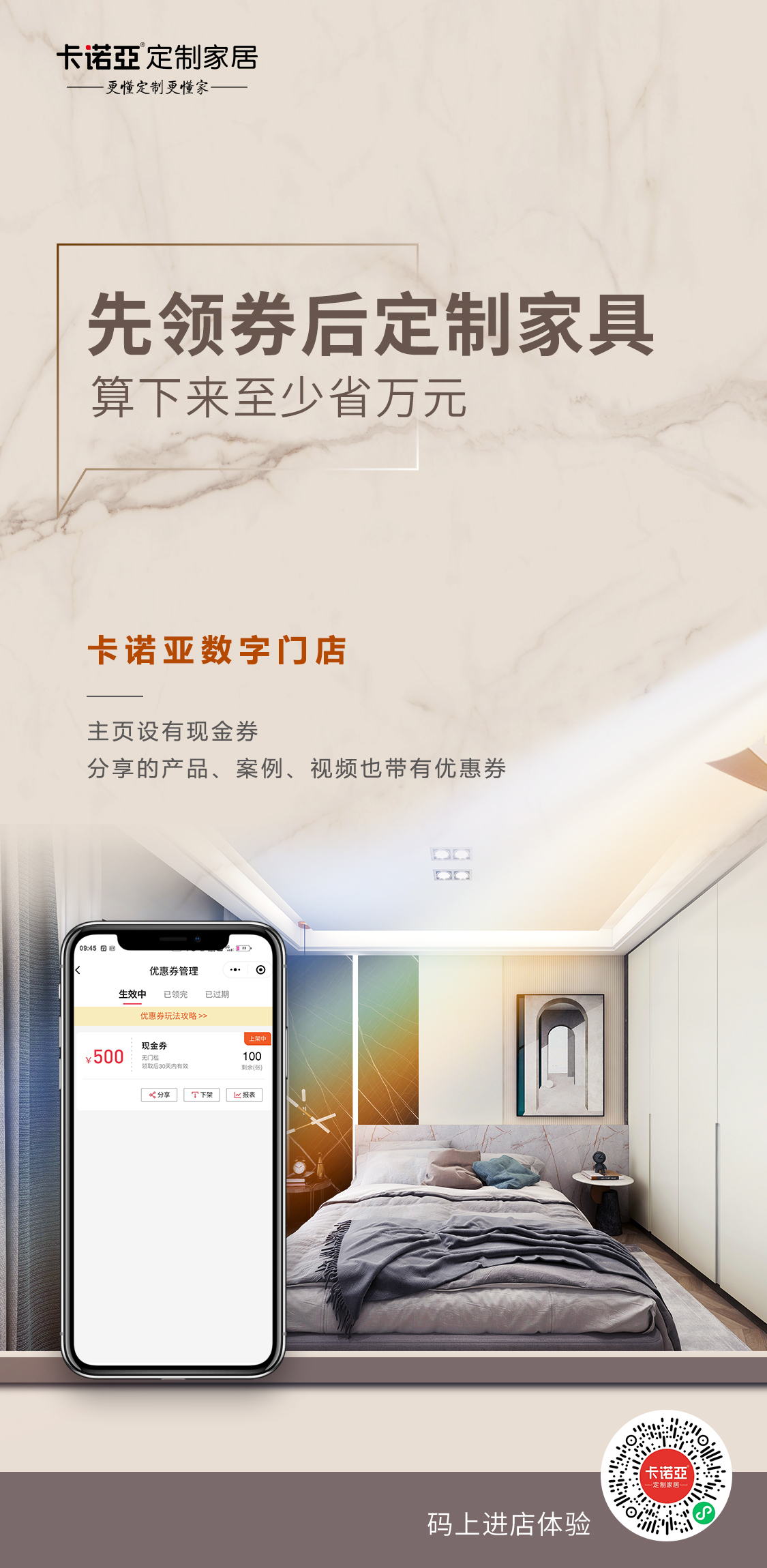 每逢节假日,建材家居市场各大门店促销活动硝烟弥漫。五一、国庆中秋小长假,正逢装修高峰期,像卡诺亚这样的一线定制家居品牌,都会利用线上数字门店发起各式各样的活动,赋能经销商门店,而优惠券就是门店使用最频繁的营销工具之一,靠它玩转微信营销,实现社群裂变。但是,一张小小的电子优惠券,使用起来还是大有学问呢。
